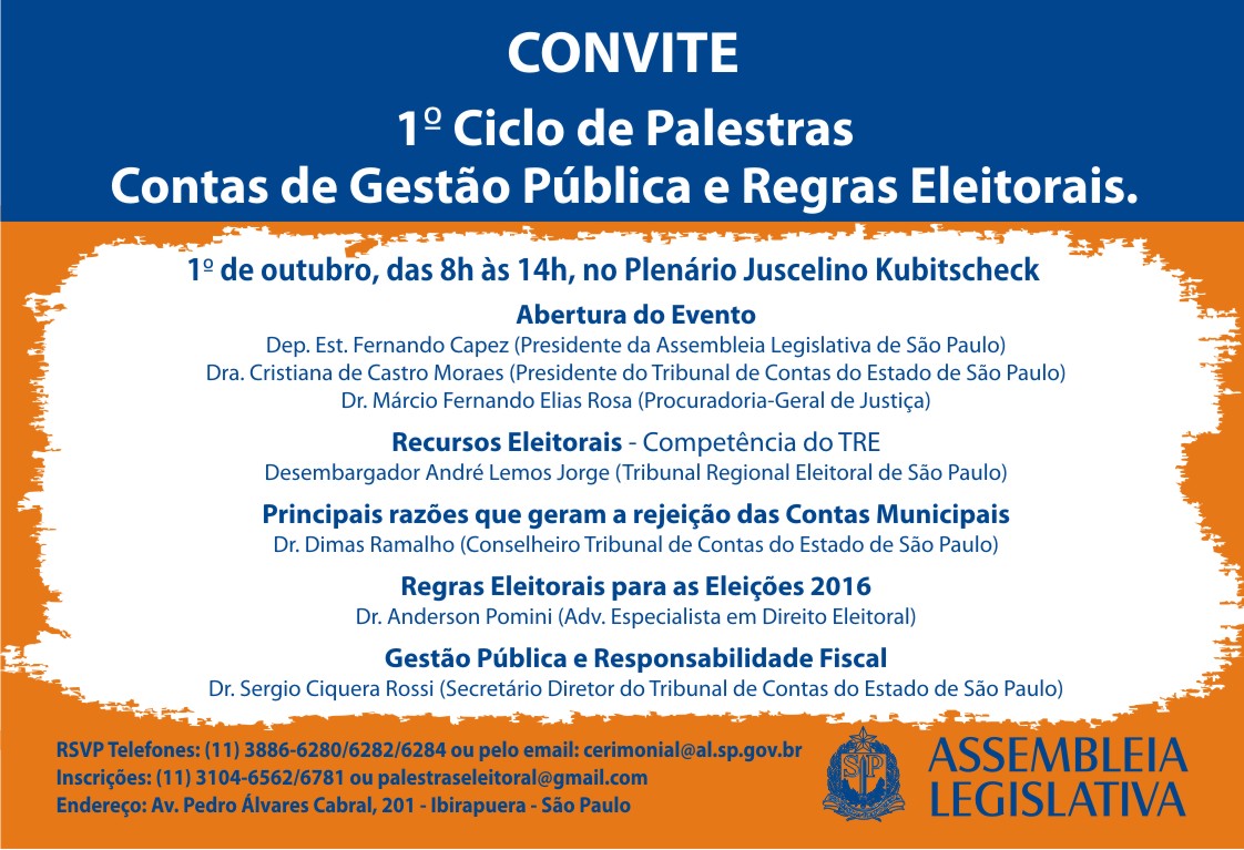 O encontro com todos os prefeitos será realizada no próximo dia 1.° de outubro (quinta-feira), das 8h às 14h, no Plenário Paulo Kobayashi da Assembleia Legislativa do Estado de São Paulo – Av. Pedro Álvares Cabral, 201 – Ibirapuera – São Paulo – Telefones: (11) 3886-6039 ou 3886-6282.