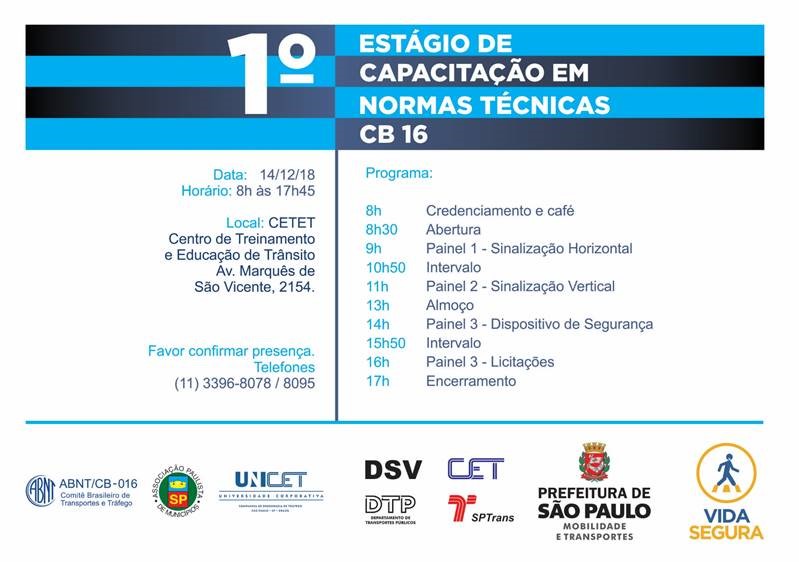 Srs(as) Prefeitos(as) Enviamos Convite para o 1º Estágio de Capacitação em Normas Técnicas – ABNT – CB 16. O evento é uma realização em parceria da Prefeitura do Município de São Paulo, Secretaria Municipal de Mobilidade e Transportes do Município de São Paulo, Universidade Corporativa da CET – UNICET, Associação Brasileira de Normas Técnicas – […]