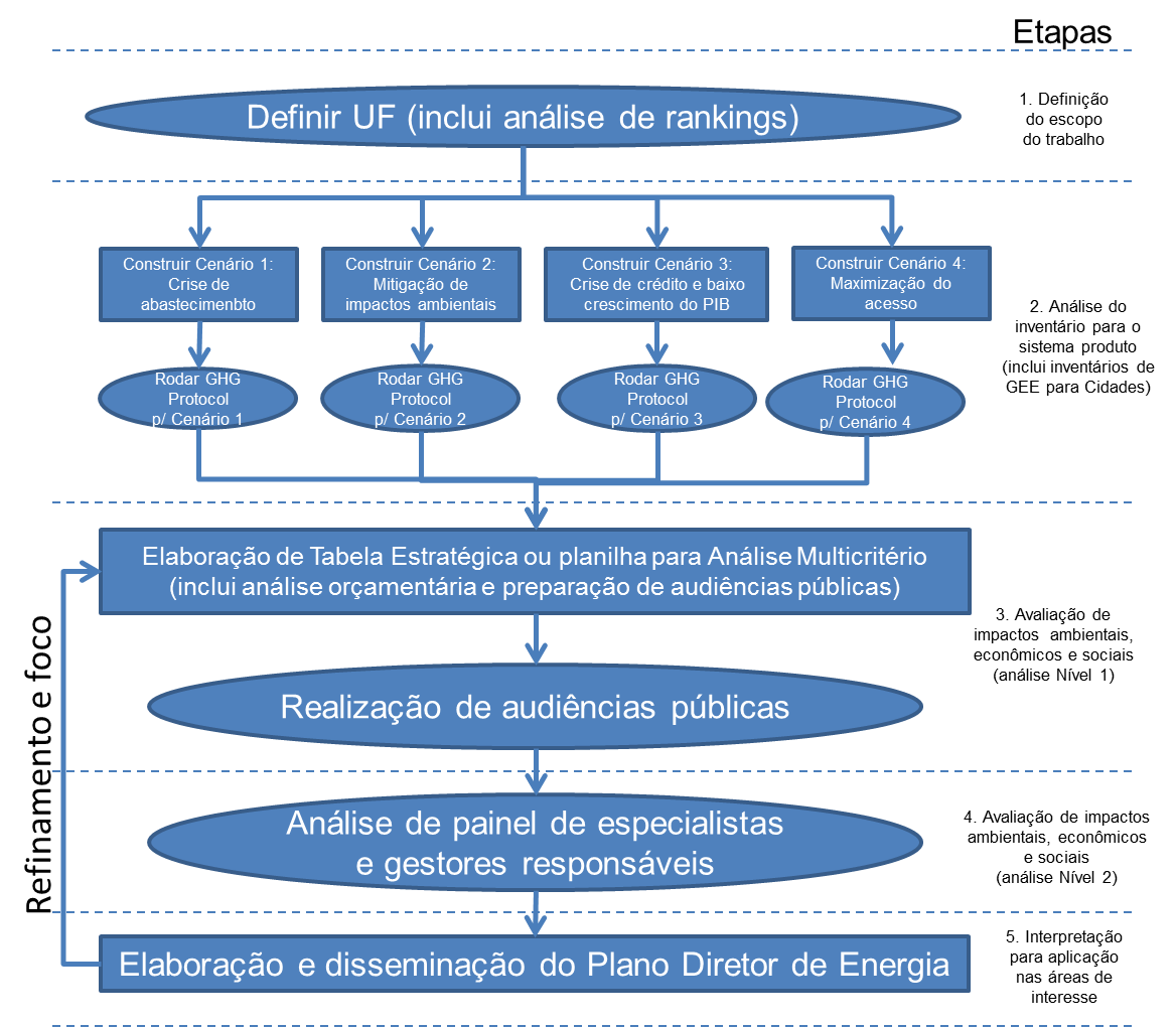 No uso de cenários, torna-se relevante a aplicação de uma ferramenta disponível e fácil de usar para a identificação e ranqueamento dos efeitos de cada decisão. Neste caso recomenda-se a aplicação do GHG Protocol amplamente conhecido para esta finalidade como indicador, considerando-se o foco em energia. É relevante também respeitar as grandes linhas estabelecidas para o Plano Nacional de Energia – PNE2050, elaborado pela Eletrobrás em 2020, que estabelece as principais oportunidades e desafios para o sistema nacional (Eletrobras, 2020), principalmente na composição dos cenários de análise.