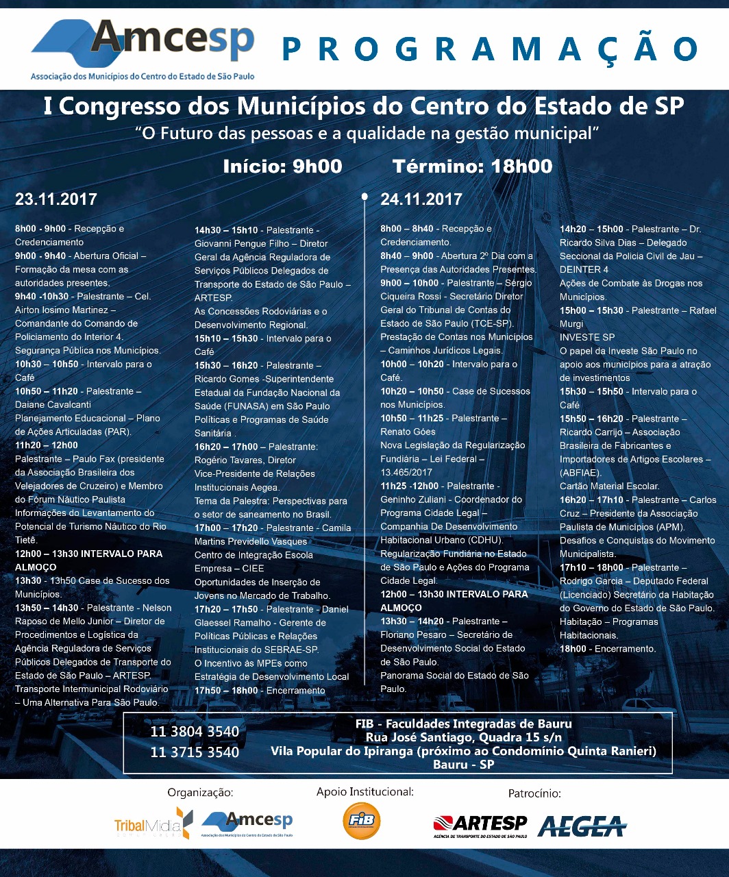 O presidente da APM, Carlos Cruz, participa nesta sexta, 24, na cidade Bauru, do I Congresso de Municípios do Centro do Estado de São Paulo. O evento acontece nas dependências da Faculdades Integradas de Bauru (FIB). Carlos Cruz vai discorrer sobre o tema “Desafios e Conquistas do Movimento Municipalista”, entre 16h20 e 17h10.