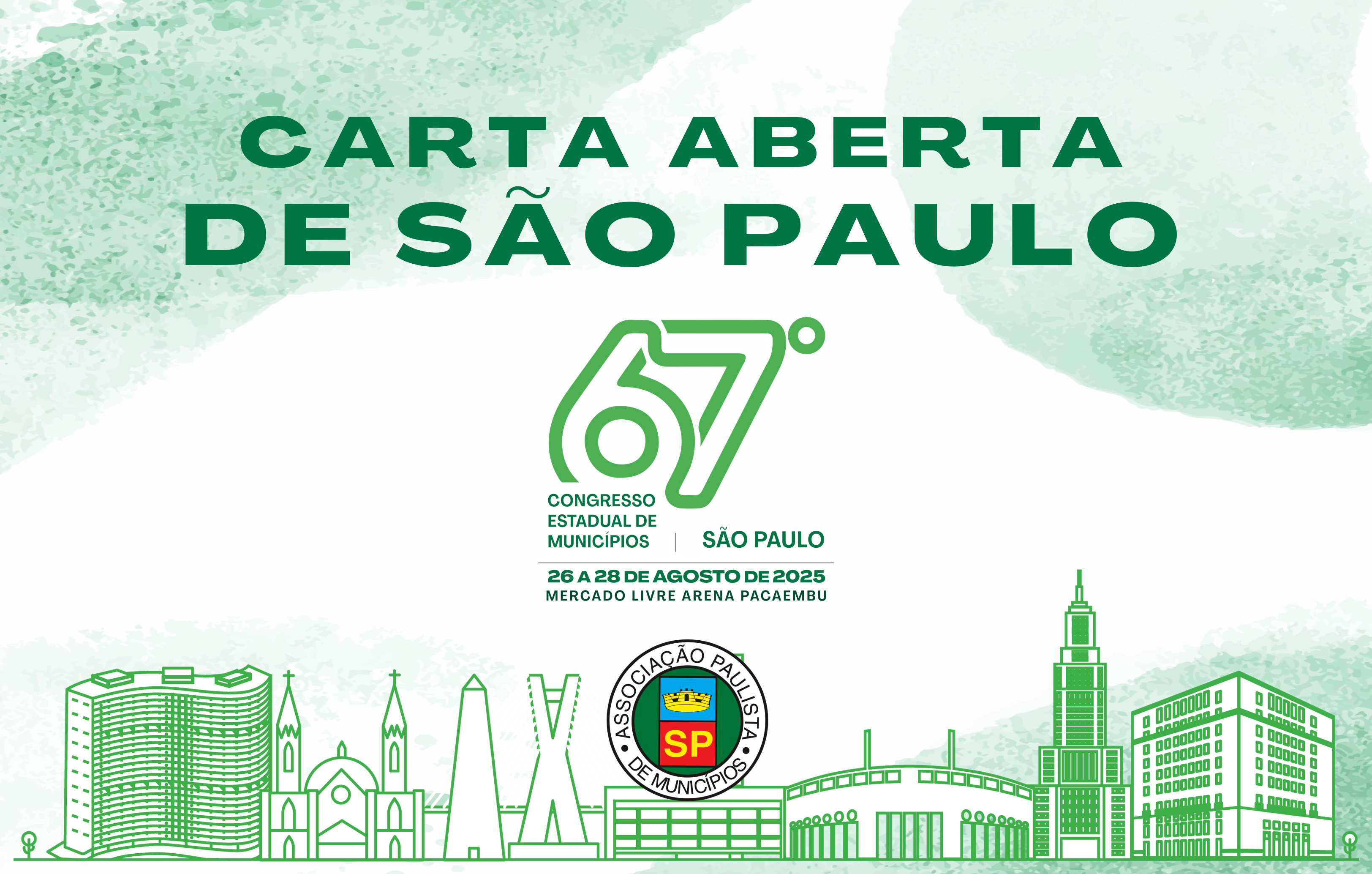 Nós, Congressistas reunidos no 67º Congresso Estadual de Municípios, realizado no Mercado Livre Arena Pacaembu, em São Paulo, entre os dias 26 e 28 de agosto de 2025, na presença de prefeitos e prefeitas, vereadores e vereadoras, secretários e secretárias municipais, gestores técnicos, parlamentares estaduais e federais, ministros de Estado e seus representantes, membros do Poder Judiciário e do Ministério Público, representantes dos Tribunais de Contas, de entidades da sociedade civil e da comunidade acadêmica, deliberamos pela aprovação da presente Carta de São Paulo.
