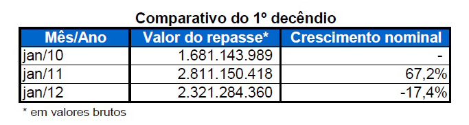 10/01/12 – O Fundo de Participação dos Municípios (FPM) depositado nesta terça-feira, dia 10, é 17,4% menor em comparação ao mesmo período de 2011. Portanto, o repasse destinado às contas municipais não apresentou o desempenho registrado no início do último ano.