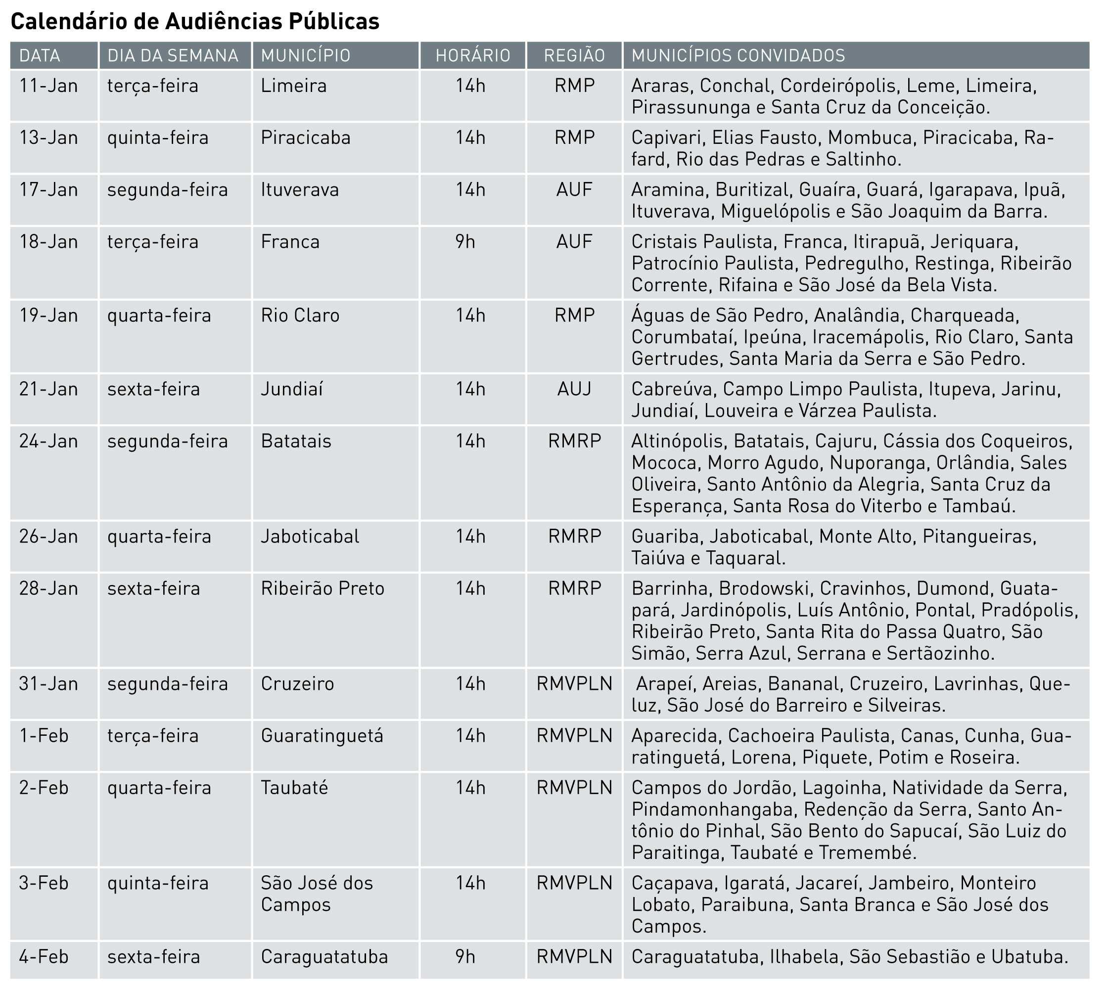 A audiência teve como objetivos ampliar o conhecimento da população sobre o planejamento urbano regional e colher subsídios e propostas que irão compor o Caderno de Insumos do plano e estimular o debate. O processo de elaboração do PDUI do Agrupamento de Franca inclui, além das audiências, uma Plataforma Digital, que permite a consulta de informações sobre a região e o envio de propostas até sete dias úteis após as audiências.